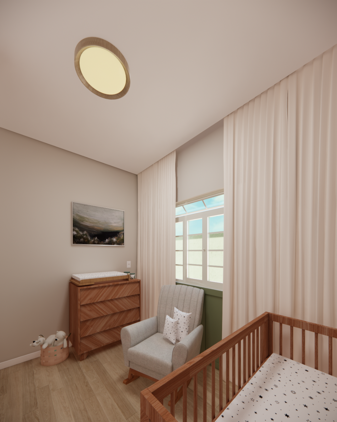 Torna-se importante ressaltar que os novos revestimentos e a adequação da iluminação convidam não apenas o olhar, mas também os demais sentidos à calmaria que um quarto infantil requer. Ademais, a adaptabilidade deste espaço foi mantida por meio da utilização de móveis modulares, com exceção à marcenaria planejada do roupeiro, pensando na multiplicidade dos anos da infância.